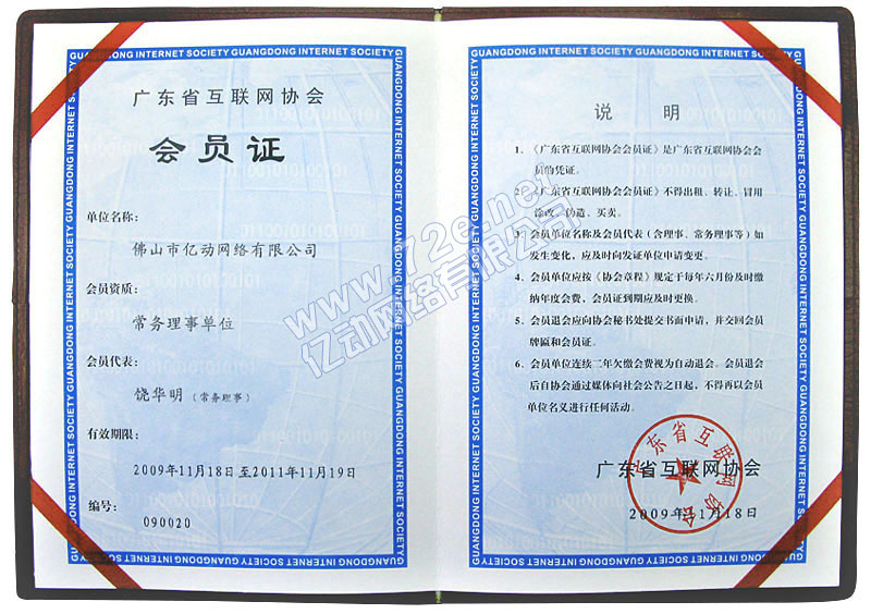 广东省互联网协会常务理事单位会员证