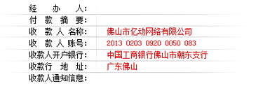 | 中国工商银行佛山市朝东支行 | 广东佛山 | 2013 0203 0920 0050 083 | 佛山市亿动网络有限公司 |